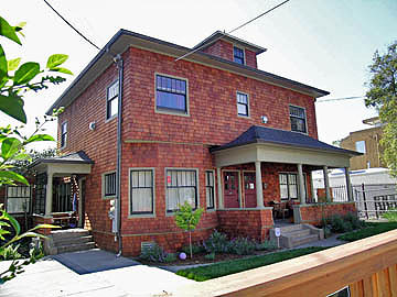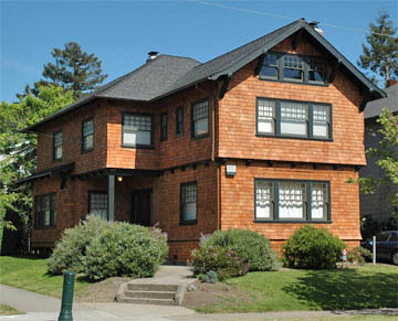 (architect unknown, 1911)The two-story, brown- shingle house straddles the Berkeley-Oakland border: the street address and front door are in Berkeley, taxes are paid to Oakland, which also issued the building permits. The current owners (the third for this house) began extensive work in February 2005 and completed the restoration in December of the same year. The foundation was replaced, and drainage added. Plumbing and electricity were updated. Chimneys were taken down to the roofline, reinforced, and reassembled with stainless steel flues. Three layers of old roof were removed and replaced. The weathered cedar shingles were removed and replaced with new cedar shingles, which were then stained. New copper gutters and downspouts with hand-detailed straps add subtlety to the detailing.