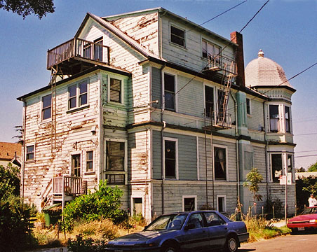 The 1923 Berkeley Fire did away with much of the original housing stock on the Northside, and post-fire development took care of the rest. Of all the Victorian mansions that once graced this block, the Boudrow House is the only one remaining, now surrounded by apartment buildings. In 1970, this house, too, was threatened with demolition. Instead, it was converted into ten apartments. In 1976 it was designated a City of Berkeley Landmark.