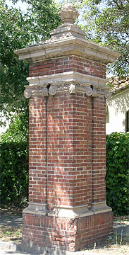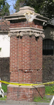 (John Galen Howard, 1907)A series of classically inspired brick gateways designed by John Galen Howard mark the boundaries of Duncan McDuffies elegant Claremont Court subdivision. In 2005, one of the gate pillars on Derby Street was badly damaged by a large truck, which cracked and dislocated the shaft. A large portion of the upper cornice was broken off, and the plaster finial representing a cluster of acanthus leaves was missing.