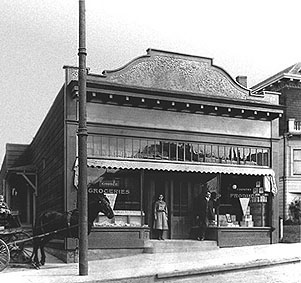 (C.R. Madison, builder, 1908)Built for George Hunrick in 1908, the structure was designed as a grocery store with a residence in the rear. Mr. Wing Pon was the last owner to operate a grocery store in this building (from 1960 to 1966). Later he allowed the structure to fall into total decay. The building was boarded up and unused for many years. It was ldesignated a City of Berkeley Landmark, Structure of Merit, in 1988. The existing building was beyond repair, so the developer-architects strategy included razing what was left of the existing structure and reconstructing a small new structure at the street that retains elements of the original Mission Revival fa�ade as well as the grocery sign.