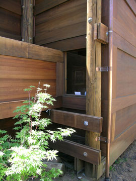 The redwood plywood used throughout the building as both interior and exterior siding proved to have little decay resistance. By the time this house was rebuilt in the early 1990s, redwood plywood was no longer being laminated from redwood but consisted of Douglas fir plywood covered on one side by a thin redwood veneer. There was extensive decay of the plywood concealed behind many of the heavy redwood trim boards, while the plywood exposed to the weather appeared to be sound.