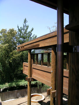After ascertaining that each section of the exterior is sound enough to leave in place, the plywood is clad with solid redwood shiplap siding over a layer of building paper, allowing the inclusion of a conventional copper flashing detail to direct any water to the outside of the assembly. In the deck railings and other assemblies outside ofthe building envelope, the original plywood is being replaced with pressure-treated plywood covered by the new shiplap siding.
