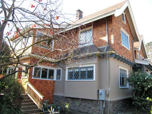 Since many windows were added, steel moment frames were required to satisfy lateral loads. The frames in turn required new foundation work. The frames were skillfully hidden inside the original walls. Then floor joists were discovered, bearing on the unreinforced historic clinker-brick skirt base. The bricks had to be removed and reinstalled over a new foundation. Shear walls were built, stucco and shingles were replaced, and exterior plumbing was rerouted. The end result is a kitchen that looks as if it were built at the turn of the 20th century but will last well into the 21st.