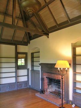 Chauncey Wetmore Wells, who taught English Composition at the University of California since 1901, was made a full Professor of English in 1919. After 20 years of renting, Wells and his wife could finally afford to build a house of their own. Finding an architect was easy—their next-door neighbor was Roland Stringham, who also happened to be a fraternity brother of Professor Wells. The young architect, then in his late 20s, designed a house inspired by English manors. At the southern end, a semi-detached apartment above the garage provided bachelor housing for Professor Durham from the English department. His drawing room had a magnificent high vaulted ceiling with exposed rafters. Future owners of the housethe second owners were Helen and Alexander Meiklejohnadopted this room as a study.