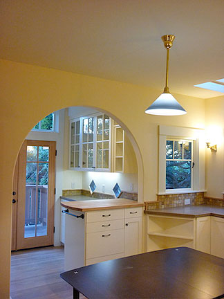 The kitchen after the fire (courtesy of Bill Mastin)A highlight of the “new house” is in the dining room, where a fireplace chimney was removed. This created a light, open effect in what had been a dark room. Skylights “up the chimney” now bring in natural light. The change also allowed for a pass-through, with a counter retaining the shape of the original fireplace and chimney. The kitchen, remodeled in the 1990s, has been rearranged, and an open arch leading to a back alcove was recreated. The recent remodel now includes a tidy rear deck overlooking the garden.
