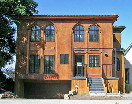 They replicated the general front fa�ade, the arched window niches and pilasters, and the window placement, adding a front stoop and door. The new roof is hipped and clad in clay tiles, and the stucco walls are tinted in hues of burnt Sienna, evoking the Mediterranean atmosphere of the vanished house.