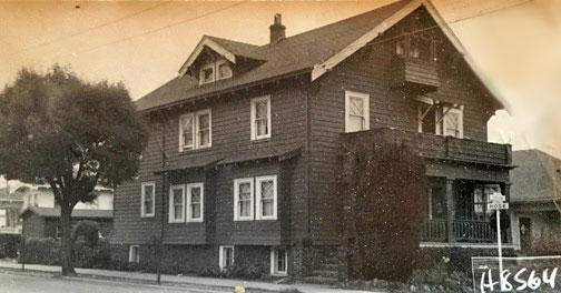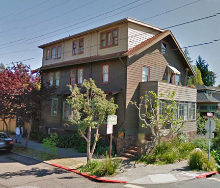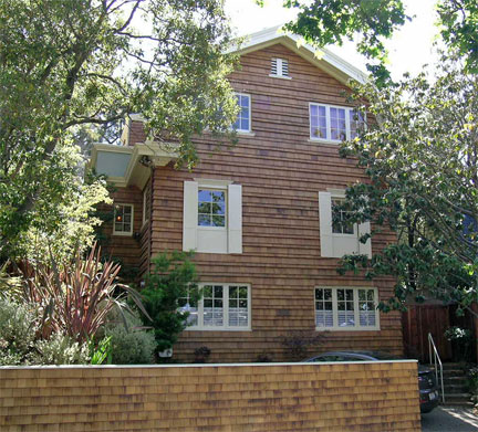 One of Berkeley’s most celebrated residences of the early 20th century, Weltevreden was a unique clinker-brick structure featuring a stepped gable in the Dutch style. In the mid-1920s, the building became a fraternity house, and by the mid-1950s it was condemned and facing demolition. Architect Michael Goodman drastically altered it in 1957, lopping off the gables and building two stucco-clad floors in their stead.