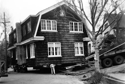 The Hunt House in its original location on Spruce Street (BAHA archives)By the 1960s, development pressures had intensified around the campus, and the Hunt House was moved to its present location in 1964. Here it was turned 90 degrees to fit the narrow lot, raised to allow for a new ground floor, and painted gray and blue.
