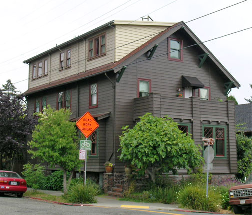 Presenting its narrow side to the street, this three-story Dutch Colonial Revival residence reveals only a small facet of its true appearance. Designed for the Dean of the College of Agriculture at the University of California, the house was built on the Northside, at 1800 Spruce Street, where it appeared far lower and far more ornate than it does now. In 1927, it gained a worthy neighbor across the street in the form of Normandy Village.