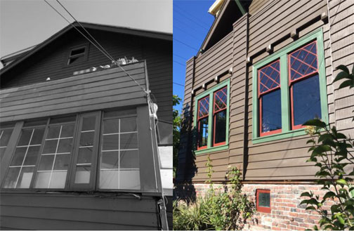 The porch, before and after renovation (collage courtesy of the owners)When the house was left to the next generation, the offspring set about righting the wrongs of the past. By now, the haphazardly transformed front porch on the west fa�ade was dilapidated. The remodeled porch features tapered columns, flared siding, detailed beam-ends, and double-hung wooden windows that replicate the original diamond-paned ones in the rest of the house. Roof brackets that were removed years ago from the upper roof have been reintroduced. The west fa�ade now proudly anchors the house to its prominent neighborhood corner.