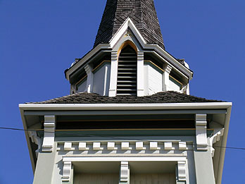 Photo: Gustavo CaldarelliReflecting its Episcopalian denomination, the Church of the Good Shepherd is considerably more ornate and playful than its severe Presbyterian model, with Victorian ornamentation on the fa�ade walls and decorative shingle patterns on the spire roof. The building appears more earth-bound and less vertical than the Mendocino church, owing not only to the wider tower but also to the shape of the windows and the treatment of the belfry.