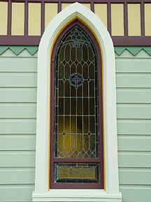 This small church boasts no fewer than ten stained-glass windowstwo large and eight small ones. The pseudo-Gothic buttresses supporting the tower and the chapel are hollow wooden boxes. The eighty-foot tower contains a thousand-pound Blymer bell. Until 1894, the latter fulfilled the double function of church bell and fire alarm.