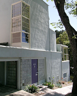 The transplanted New Yorker Joseph W. Harris commissioned a thoroughly urban house, with opulent detailing and rich materials that would have been at home in the swankiest Manhattan penthouse. Hard-edged surfaces abound: stainless steel, aluminum, marble, mirrors, and glass block. Yet this quintessentially man-made environment was open to the outdoors. With no space for a garden on the tight lot, the deep balcony off the living room served as a sunny patio at a time when the neighborhood was sparsely built and full bay views were to be had even from the ground floor.