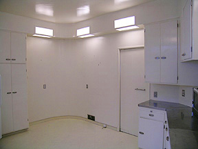 In contrast with the hard brilliance of the living room, the dining room is an enveloping, wood-paneled space. This octagonal room makes good use of all four corners by tucking closets into them. The closet between the living room and the kitchen is a built-in liquor cabinet complete with mirror-backed shelves and a folding stainless-steel table for mixing cocktails. This closet also provides rear access to one of the two fluorescent lamps flanking the living-room fireplace.