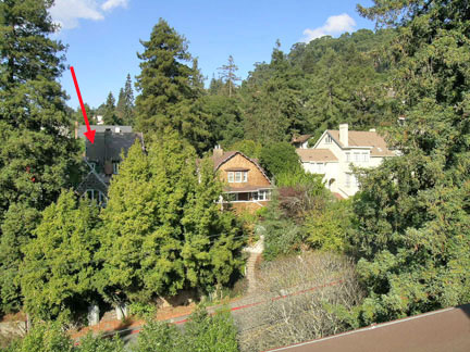 Le Conte Avenue as seen from the roof of Kingman Hall. The arrow points to the Kluegel House. To the right are the Bentley House (A.H. Broad, 1900) and the Hatfield House (Julia Morgan, 1908).