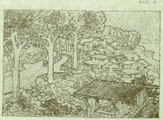 With neighborhood cooperation the roadside banks, terraces etc. can be planted systematically in blocks instead of lotsnot fifty feet of pink geraniums, twenty-five of nasturtiums, fifty of purple verbenas, but long restful lines, big, quiet masseshere a roadside of gray olive topped with purple plum, there a line of trailing willows dipped in flame of ivy covered wallslong avenues of trees with houses back from roads, hidden behind foregrounds of shrubbery. (Fig. 2) Bushnell place is such a one. Grass on a hillside looks bare; the same strength and water put on trees and bushes will be more effective.