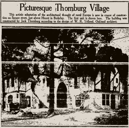 The developer and builder of this bohemian enclave was a 25-year-old Californian by the name of Jack Wood Thornburg, who had already built (and in some cases designed) several houses in north Berkeley, all in Storybook style (see Jack W. Thornburg Projects in Berkeley). On Spruce Street, Thornburg planned to build a self-contained community with shops, but zoning restrictions precluded the inclusion of commercial units. At the opening of the first phase, the developer told the Tribune that he was proposing to complete a group of several units. Each unit, virtually a unique apartment building with several apartments, will be individually owned. Thornburg advertised for investors in the same issue in which the Tribune carried the article.