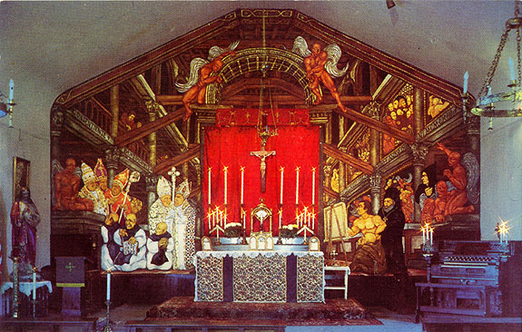 The church interior being rather plain and austere, Smith set about adorning it. He was fortunate to meet the Albany artist Gerald Gaxiola, who agreed to paint a mural on the empty wall behind the altar. Gaxiola, later to gain a modicum of fame as the subject of Les Blanks film The Maestro: King of the Cowboy Artists, spent four months populating the wall with life-size figures forming an ecumenical survey of Catholicism. The deep-perspective scene also included Lawrence Smith, dressed in black robe and cowl, and the bare-chested, muscle-bound artist at his easel. At the very top, two adult male angels in their birthday suits, wings flapping, looked down on the mitered crowd.
