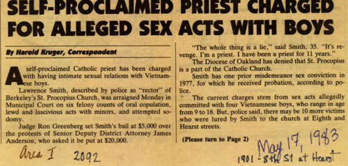 In 1977, Smith was one of 20 candidates running for the Berkeley city council. The same year, he was convicted on a misdemeanor child molestation charge and sentenced to probation. The police kept an eye on him thereafter. They said he was in the habit of picking up boys at James Kenney Park, as well as in San Francisco and Oakland, but no evidence against him turned up. In 1983, Smith was charged with six felony counts of sexually abusing Vietnamese and Hispanic boys. He was sentenced in January 1984 and served nine years in prison. Smith continues to deny all the charges, insisting on his complete innocence.