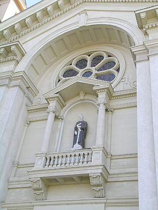 Choir loft and confessionals (photo: Daniella Thompson, 2004)Alternating with the windows on the nave and transept walls are 14 beautifully carved and painted sculptural ensembles representing the Stations of the Cross. Four massive oak confessionals, no longer in use, are clustered along the northern side of the nave, under the choir loft. They feature dentiled broken pediments, scrollwork, and arched doors flanked by smooth columns crowned with Ionic capitals.