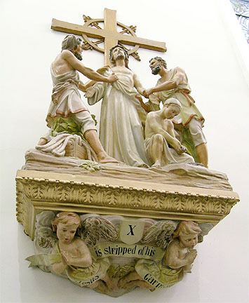 The Tenth Station of the Cross, one of 14 sculptural ensembles at St. Joseph the Worker (photo: Daniella Thompson, 2007)Ten of the Mayer windowseight in the nave and one at each end of the transeptdepict scenes from the life of Christ. Above the two transept windows are large rose windows. A third rose window graces the choir loft on the north side. Below the choir, a transom window displaying a crown and a cross is positioned above the main entrance to the nave.