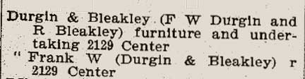 Durgin & Bleakleys first listing (Husteds Oakland, Alameda & Berkeley directory, 1895)Initially, both partners lived on the premises. Within a year, the enterprise had grown sufficiently to separate furniture store from mortuary and residence from business. Frank W. Durgin managed the undertaking half, while Robert Bleakley ran the furniture store.