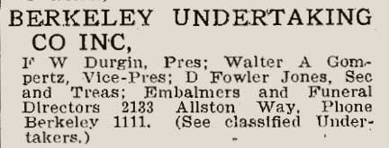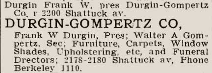 Listing in the 1909 directoryLess than two years into the new partnership, Durgin founded a second mortuary under the name Berkeley Undertaking Co., Inc. This business was located at 2133 Allston Way, and its telephone number, Bkly 1111, differed from that of the Durgin-Gompertz Co. number (Bkly 1110) by a single digit.