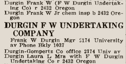 Listing in the 1916 directoryFor several years, the two mortuaries founded by Durgin continued their separate operations, Durgin conducting business and maintaining a residence at 2174 University Avenue, Ward working out of premises at 2201 Bancroft Way.