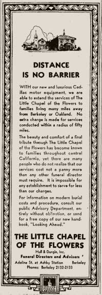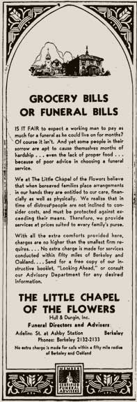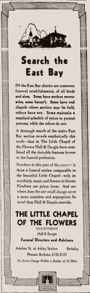 San Francisco Call, 2 Feb. 1895Forty-seven years later, the 1943 telephone directory carried a full-page ad for Hull & Sons, Pioneer Funeral Directors and The Little Chapel of the Flowers, 3051 Adeline Street. The headline promised A Reference Built on 50 Years of Service, 18921942, and the tagline signed off Serving You for Half a Century.