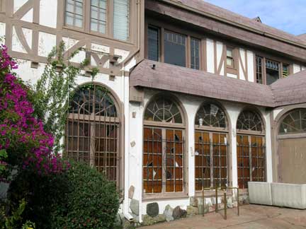 Mock stained-glass windows on Hull mortuarys south façade (photo: Daniella Thompson, 2005)The Hull mortuary building, which cost $28,000 and opened in February 1924, is a strange amalgam of English country vernacular and Mediterranean-influenced architecture. The curved roof, once covered in wood shakes, is meant to resemble thatch. The second-floor walls incorporates pseudo half-timbering in the Tudor Revival style, while the ground floor boasts large arched windows with mock stained glass. The arched windows originally illuminated the Conservatory Chapel within.