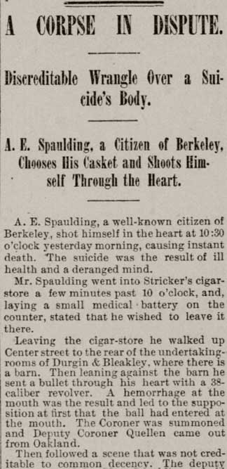 Not long before his suicide, Spaulding had made arrangements for a burial casket, but contrary to his own preference, Spauldings body was carried down to West Berkeley and back before being taken to an Oakland funeral parlor.