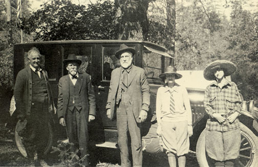l to r: Frank Durgin, architect William Wharff, Mr. Jory, Muriel Durgin & Victoria at Berkeley Camp, south fork of Tuolumne River, 1920s (BAHA archives)On the morning of 1 February 1895, a Berkeley carpenter by the name of A.E. Spaulding entered Strickers cigar store at 2132 Shattuck Avenue. Laying a bundle of medications on the counter, he announced that he wished to leave it there. Then he walked to the rear of Durgin & Bleakley, a furniture and undertaking establishment at 2129 Center Street. Leaning against a barn, Spaulding shot himself through the heart with a 38-caliber revolver.