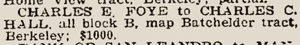 Oakland Tribune, 2 August 1904On Aug. 2, 1904, the Oakland Tribune published a deed transfer of four lots in Block B of the Batchelder tractincluding the Foye housefrom Charles and Harriet Foye to Charles C. Hall. In December 1906, Foye sold Hall the rest of Block B for a reported $1,000.