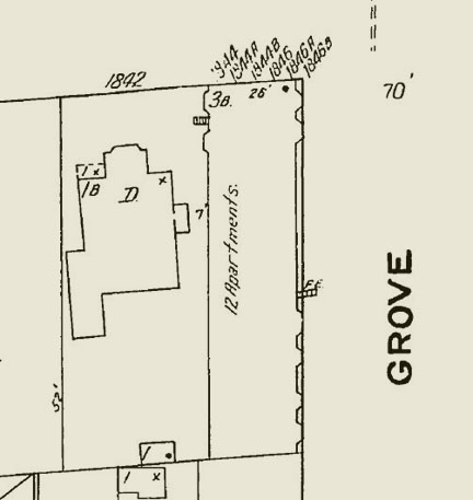 Heywood Apartments, 1844–46 University Ave., east fa�adeAs shown in the Sanborn fire insurance map of 1911, the actual building constructed at 1844–46 University Avenue was a long and narrow block with no setbacks, occupying the full length of the lot along Grove Street. It rose to three stories and contained 12 apartments and 24 bay windows. Williams nephew, Charles, moved in right away and was still living there in 1913, after being elected mayor of Berkeley.