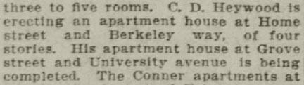 Berkeley directory listing, 1908In July 1908, the Daily Pacific Builder published a contract notice for flats to be built on the southeast corner of University Avenue and Grove Street. The owner was W.B. Heywood, the contractor George L. Mohr, and the projected cost $11,000. Nothing was built on that corner at the time, but in June 1909 construction began on another Heywood apartment housethis one on the southwest corner of the same intersection. The San Francisco Call reported that this building would cost $20,000, contain 40 apartments, and cover a lot of 75 x 150 feet. The Oakland Tribune, on the other hand, tallied the cost at $12,000 and gave floor space dimensions of 37 x 137 feet.