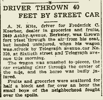 The upscale grocery trade was based on home deliveries, and Koerber delivered. On 21 March 1908, his delivery business suffered a temporary setback reported in the Oakland Tribune:
