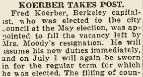A month following the election, but before he had taken his elected place on the city council, Koerber was appointed interim councilmember for a month, sitting in for Agnes Claypole Moody, Berkeleys first woman mayor, who went to Europe. By mid-September, a mere four months past the election, Koerber tendered his resignation, claiming that owing to the press of private business he was unable to devote the required time to the council.