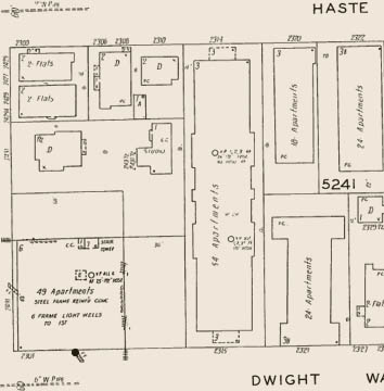 (Sanborn fire insurance map, 1911)When completed in 1907 or 08, the Lafayette Apartments had two addresses: 2314 Haste Street and 2315 Dwight Way. Although the College Homestead Tract south of the campus had been substantially built up by the first decade of the 20th century, the block where the Lafayette was sited was an exception, having contained until then only one housean early shingled residence fronting on Ellsworth Street. Until the mid-1920s, the lots around the Lafayette were vacant, fulfilling the early promise of large open space on each side for sun and light.