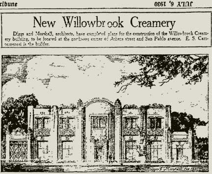 Willowbrook Creamery sketch by Diggs & Marshall, architects (Okaland Tribune 6 July 1930)In 1930, Campomenosi built for the Altman brothers a modern dairy plant to house their Willowbrook Creamery at 2519 San Pablo Avenue, Oakland. Designed by Diggs & Marshall, this elegant building, with its elaborate brickwork, proud pilasters, and fluted white entrance, has recently been used as gallery and theatre space.