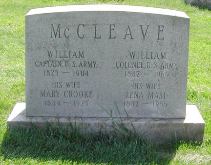 The deceased leaves a family, every male member of which except one is in the United States army, the one exception being Dr. Thomas McCleave of Berkeley. The others are Captain Robert McCleave, Lieutenant Edward McCleave and Private William McCleave. His widow, Mary Cook [Crooke] McCleave, and one daughter, Annie McCleave, also survive him. The funeral will take place on Friday morning at 11 oclock from the home under the auspices of Berkeley Lodge of Masons, Lookout Mountain Post G.A.R. and the Loyal Legion, of all of which he was a member. Interment will be in the national cemetery at the Presidio.