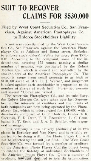 Despite its commercial success, the company ran into financial trouble through excessive indebtedness. In September 1923, American Photo Player and its Robert Morton subsidiary were taken over in the interest of creditors, and a new company, Photoplayer Co., formed to operate the manufacturing plants. Stockholders of American Photo Player Co. sued in April 1924 for liabilities of over $530,000, of which $110,000 was demanded of Harold J. Werner.