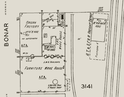 The complex in 1929 (Sanborn fire insurance map)The tenant at 2101 Bonar Street was the Oliver Organ Company, which in 1927 built the organ for the Chapel of the Chimes, then being constructed to a design by Julia Morgan. But Oliver Organ also fell victim to the Depression. Beginning in 1931, its owner, Oliver Lowe, became a building contractor.
