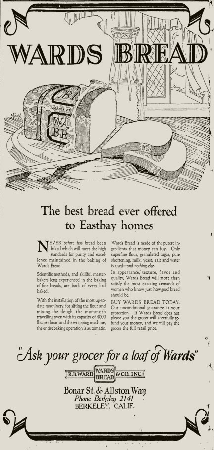 In 1929, a fire insurance map still showed the fuel and feed yard to the north of the bakery, but by 1950, the makers of Wonder Bread had swallowed up those parcels as well. The former bakery building at 1255 Allston Way is now the home of Berkeley Youth Alternatives.