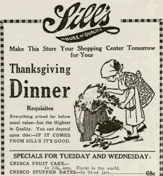 A 1917 Sills ad advertising Thanksgiving dinner requisites tells volumes about the eating habits of the time. Among the essentials offered far below usual valuebut the Highest in Quality were Cresca fruit cake in 2-lb. tins (finest in the world), Cresco stuffed dates in 14-oz. jars, and Crisco shortening in small, medium, or large cans.