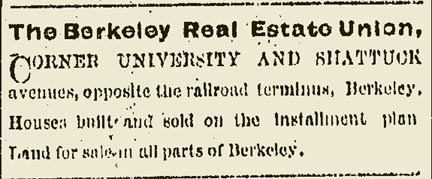 Oakland Evening Tribune, 30 January 1877The Berkeley Real Estate Union was located on the northwest corner of University and Shattuck avenues. The manager was M. McDonnell, who lived in San Francisco. The company existed only in 1877 and 1878, and during the first six months of 1877 it advertised regularly (sometimes weekly, sometimes daily) in the Oakland Evening Tribune, offering houses built and sold on the installment plan and land for sale in all parts of Berkeley.