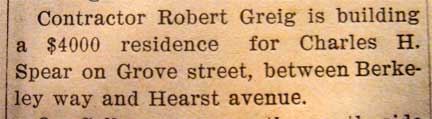 In addition to being a member of the Berkeley Republican Clubs executive committee and a trustee of the West Berkeley Improvement Club, Spear also co-managed the 1900 congressional campaign of Alameda county assessor Henry P. Dalton, a friend and associate of former Oakland mayor Dr. George C. Pardee. (Dalton was plagued by scandals throughout that year and lost the election. In 1911 he would be convicted of bribery and imprisoned at San Quentin, a few cells away from Abe Ruef, who was serving 14 years in connection with the San Francisco graft cases.)