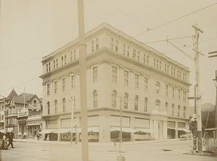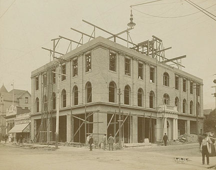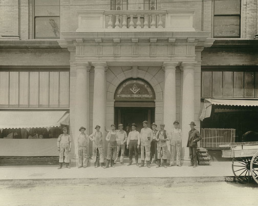 Wharff (4th from r) and the real masons who built the Masonic Temple, 1906. Note the granite pillars, later removed. (BAHA archives)