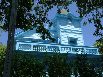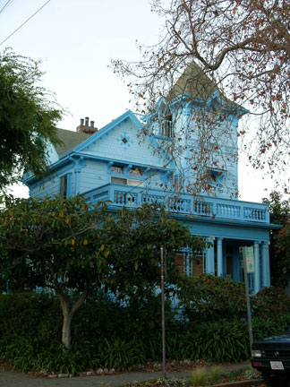 The sky-blue Victorian villapart Stick-Eastlake, part Gothic Revival, and proudly holding aloft a tower and weathervane on the northeastern corner of Francisco and Milvia Streetsis a striking sight.