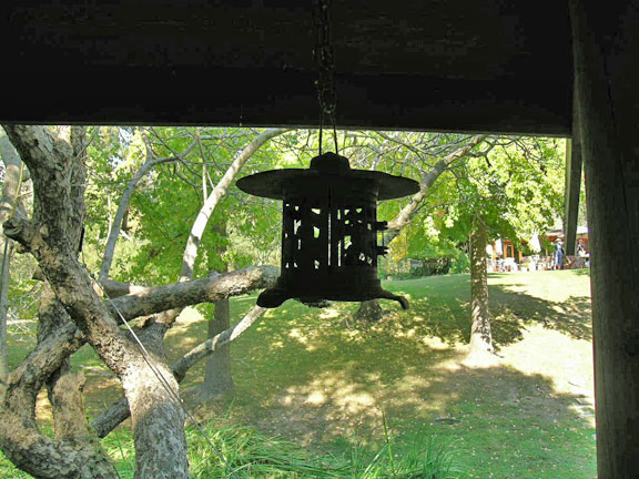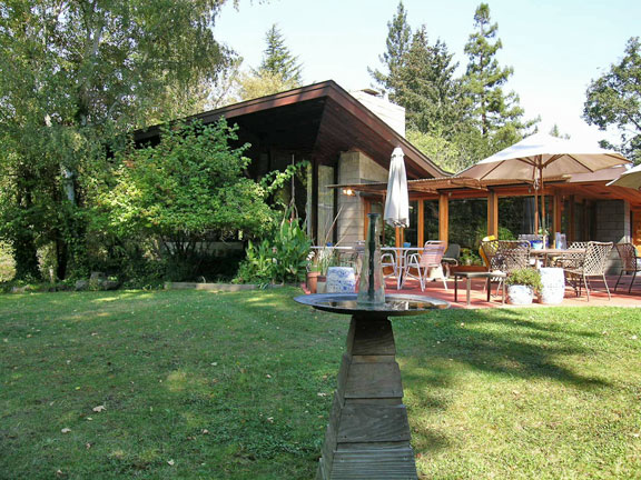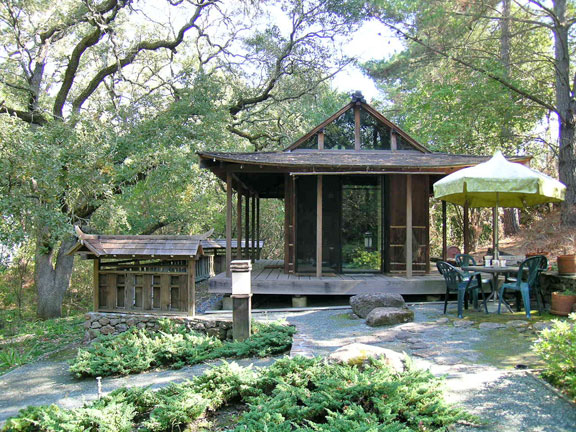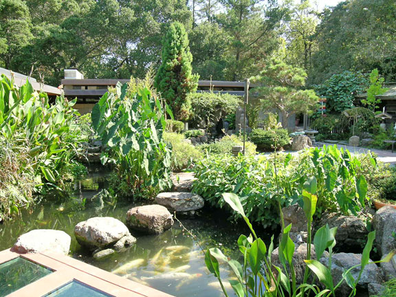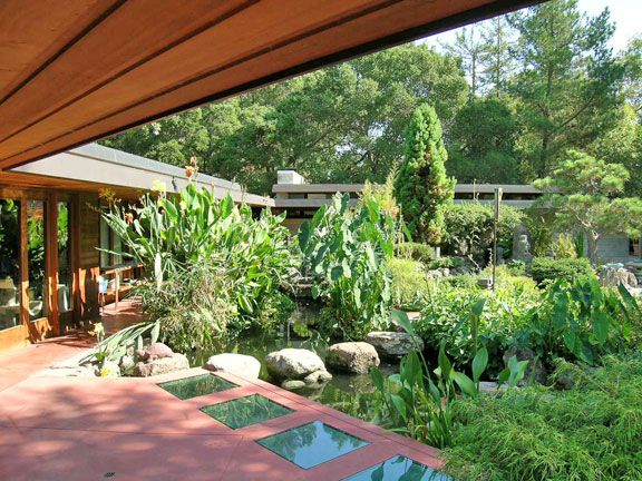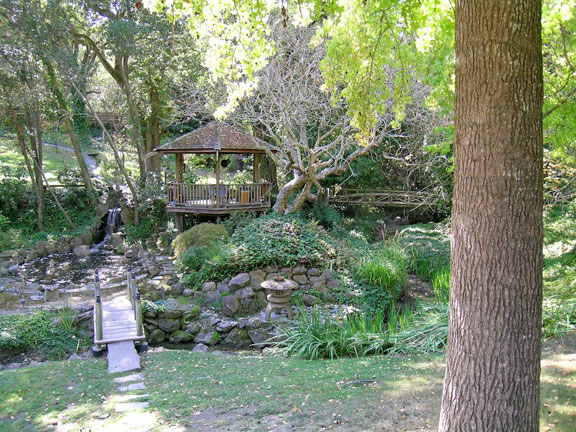 Two creeks traverse the three-and-a-half-acre lot, where native oaks cohabit with oriental landscaping, displaying to good advantage a rustic gazebo over a pond, a Japanese teahouse, and large-scale Chinese statuary. The Japanese garden was developed in the 1960s and 1970s by Henry Matsutani, an important Bay Area landscape designer.