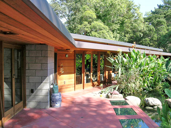 The redwood and concrete-block house features dramatic rooflines and widely varying ceiling heights, culminating in the butterfly-roofed living room.